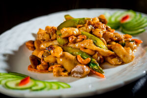 Chicken fillet stir-fry with asparagus, straw mushrooms and cashew nuts....